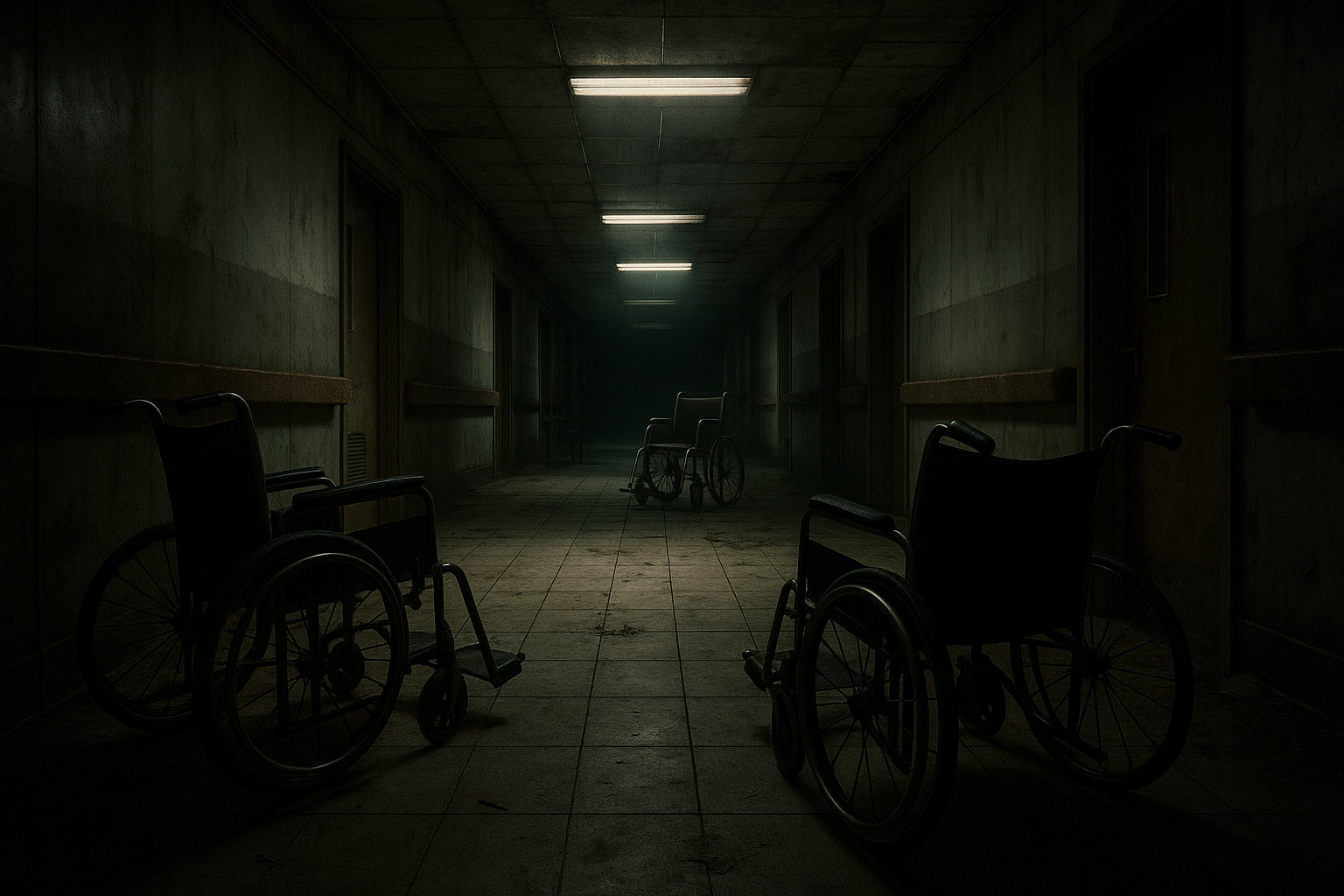 На изображении представлен длинный и темный коридор, освещенный яркими потолочными лампами, которые создают контраст с окружающей темнотой. В центре этого коридора расположены три инвалидных кресла, стоящие на плиточном полу. Стены коридора выглядят довольно старыми и изношенными, с видимыми следами от времени, что создает атмосферу заброшенности. Потолок также имеет следы износа, и тусклое освещение добавляет сцене загадочности.