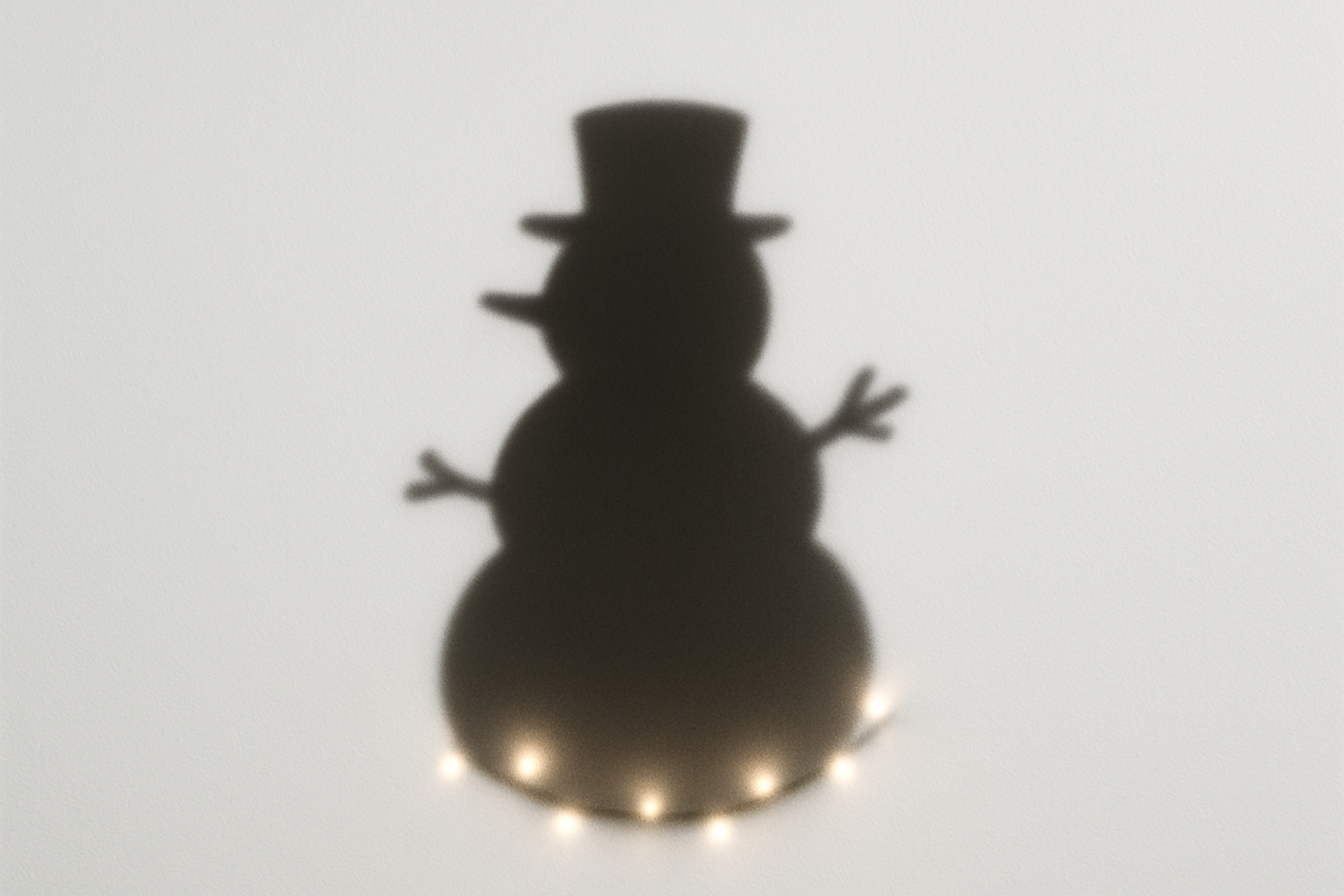 На изображении представлена тень снеговика, контрастирующая с нейтральным светлым фоном. Снеговик имеет классическую форму с двумя крупными округлыми частями тела и цилиндрической шляпой. Его лицо выражает веселость в своей упрощённой форме, а руки, выполненные в виде веток, добавляют ему игривости. Внизу силуэта размещены небольшие светящиеся элементы, которые подчеркивают его контур и создают уютную атмосферу зимнего праздника. Этот интересный визуальный эффект, создаваемый светом, делает образ снеговика привлекательным и сказочным.