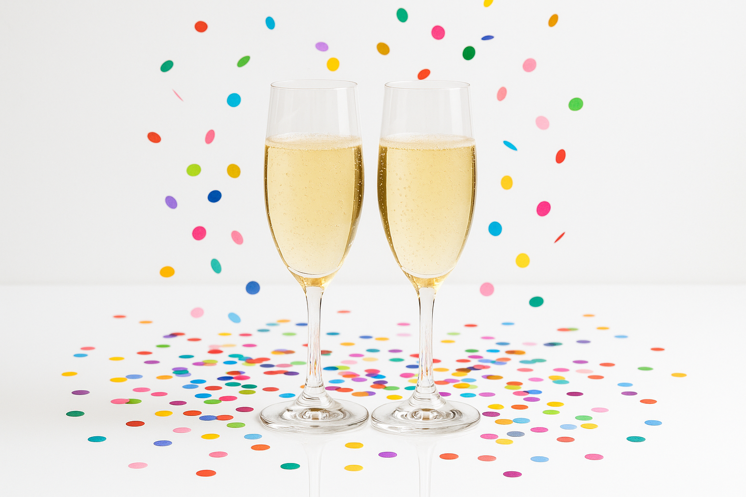 На изображении представлены два бокала шампанского, наполненных золотистым напитком. Бокалы имеют классическую форму с длинной тонкой ножкой, что придаёт им элегантный вид. Фон изображения белый и минималистичный, что позволяет сосредоточиться на бокалах. Вокруг бокалов разбросано цветное конфетти разнообразных форм и размеров, которое дополнительно подчеркивает праздничную атмосферу. Цвета конфетти яркие и насыщенные: розовый, синий, зеленый и желтый, создают ощущение веселья и радости. Такие детали делают изображение подходящим для различных торжеств, таких как свадьбы, юбилеи или корпоративные мероприятия.
