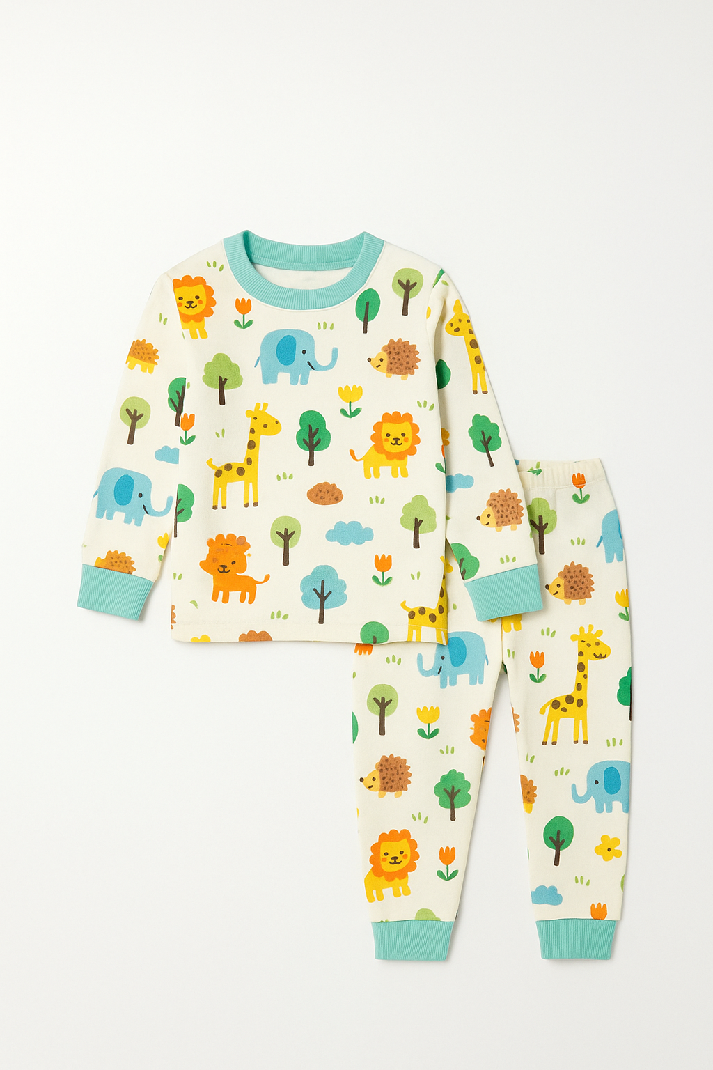 На изображении представлен комплект детской одежды, состоящий из кофты и брюк, выполненных из мягкого и приятного к телу материала. На кофте и штанах изображены яркие мультяшные животные, такие как львы, жирафы, слоны и ёжики, а также элементы природы: деревья и цветы. Цветовая палитра комплекта включает нежные пастельные оттенки, делая его привлекательным для малышей. Костюм предназначен как для небольших домашних игр, так и для прогулок на свежем воздухе.