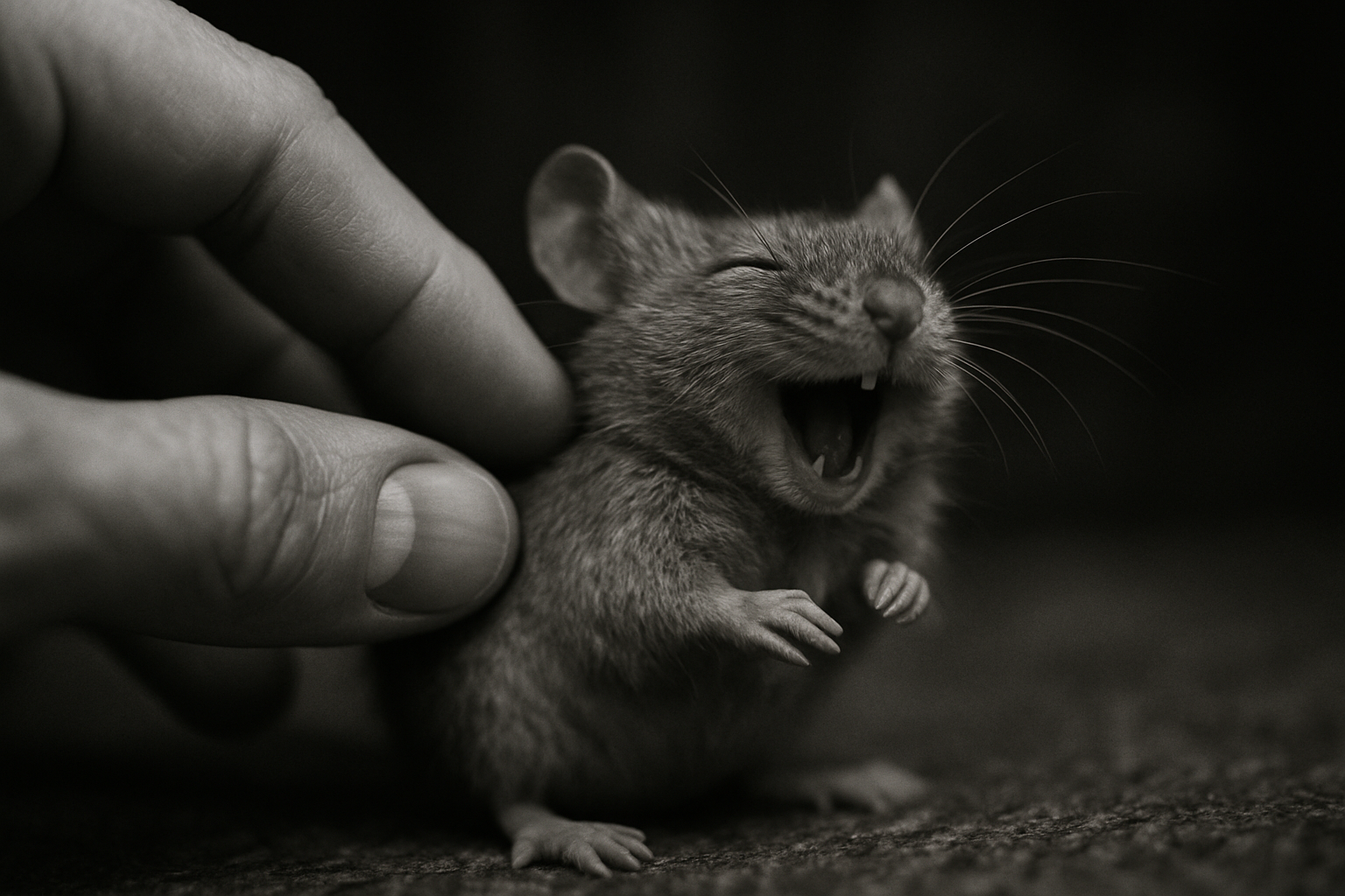 На изображении видно маленькую мышку, которая выглядит радостной и улыбающейся. Она сидит на поверхности, покрытой текстурой, а большая рука человека аккуратно гладит ее по голове. Мышка с открытым ртом, что создает эффект смеха или радости. Фон выглядит размытым, что позволяет сосредоточить внимание на взаимодействии между рукой и мышкой. Мягкие линии и текстура шерсти мыши добавляют теплоты и уюта этому моменту.