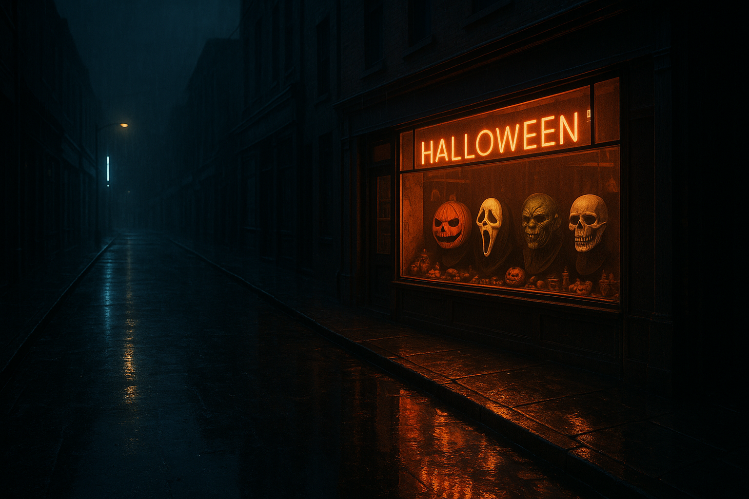 На изображении показана витрина магазина, оформленная к празднику Хэллоуин. Основное внимание привлекает яркая неоновая вывеска с надписью 'HALLOWEEN', светящаяся тёплым оранжевым цветом. В витрине размещены маски, напоминающие известные символы этого праздника, включая тыкву и черепа. Задний план выполнен в темных тонах, создавая атмосферу загадочности и немного мрачности. Улица стоит пустой и влажной от дождя, отражая мягкий свет с витрины. В такой обстановке каждый элемент, от масок до уличного освещения, подчеркивает настроение предстоящего праздника.