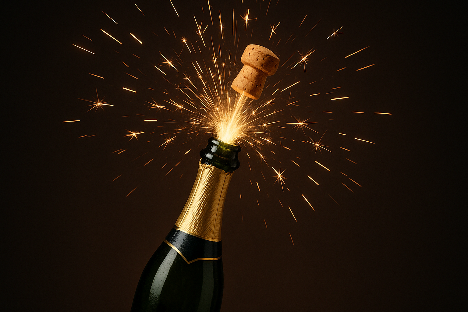 Изображение демонстрирует эффектное открытие бутылки шампанского, когда корка вылетает и создает яркие искры вокруг. На переднем плане находится высокая бутылка с золотистой этикеткой и корка, которая отлетает в верхнюю часть кадра. Задний план выполнен в темных тонах, что создает контраст с ярким блеском искр и света. Этот момент символизирует праздник, радость и торжество, такой зрелищный эффект может привлечь внимание зрителей и создать атмосферу веселья.