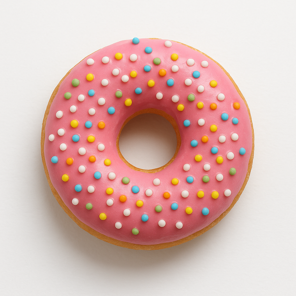 На изображении представлен яркий пончик, покрытый глазурью розового цвета. Поверхность пончика украшена разнообразной посыпкой, состоящей из маленьких круглых конфеток белого, голубого, зеленого, желтого и оранжевого цветов. Пончики являются популярным десертом и часто употребляются на завтрак или в качестве перекуса.