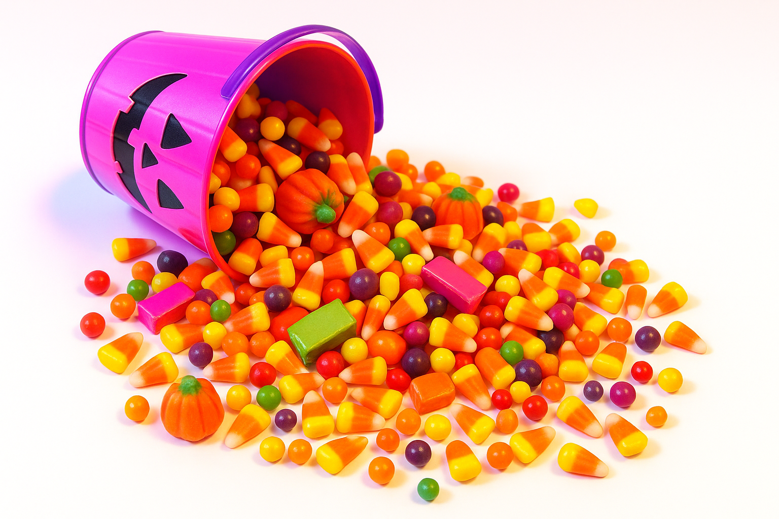 На изображении представлено яркое ведро, декорированное в стиле Хэллоуина. Ведро перевернуто, и множество разноцветных конфеток высыпаются на поверхность. Сладости включают в себя традиционные тыквенные конфетки, яркие квадратные и круглые конфеты, а также конусы с оттенками оранжевого и желтого. Цветовая палитра включает в себя разнообразные оттенки, что создает впечатление веселья и праздника. Разнообразие конфет делает изображение особенно привлекательным, вызывая ассоциации с детством и праздниками.