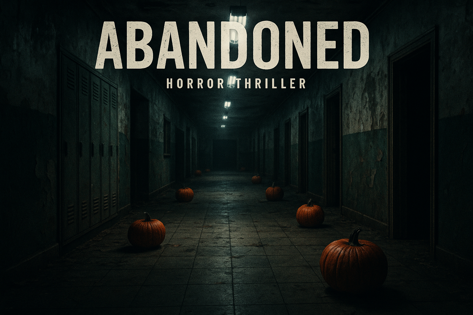 На изображении представлен заброшенный коридор, погруженный в полумрак. Стены окружены изношенными дверями и металлическими шкафчиками, которые придают сцене ощущение заброшенности. Посередине коридора расположены крупные оранжевые тыквы, что создает контраст с мрачной атмосферой и добавляет элемент сюрреализма. Освещение, исходящее от потолка, является тусклым и неравномерным, что создает длинные тени на плиточном полу. Внимание зрителя акцентируется на тыквах, которые придают этому ужасному пространству некий налет осеннего праздника.