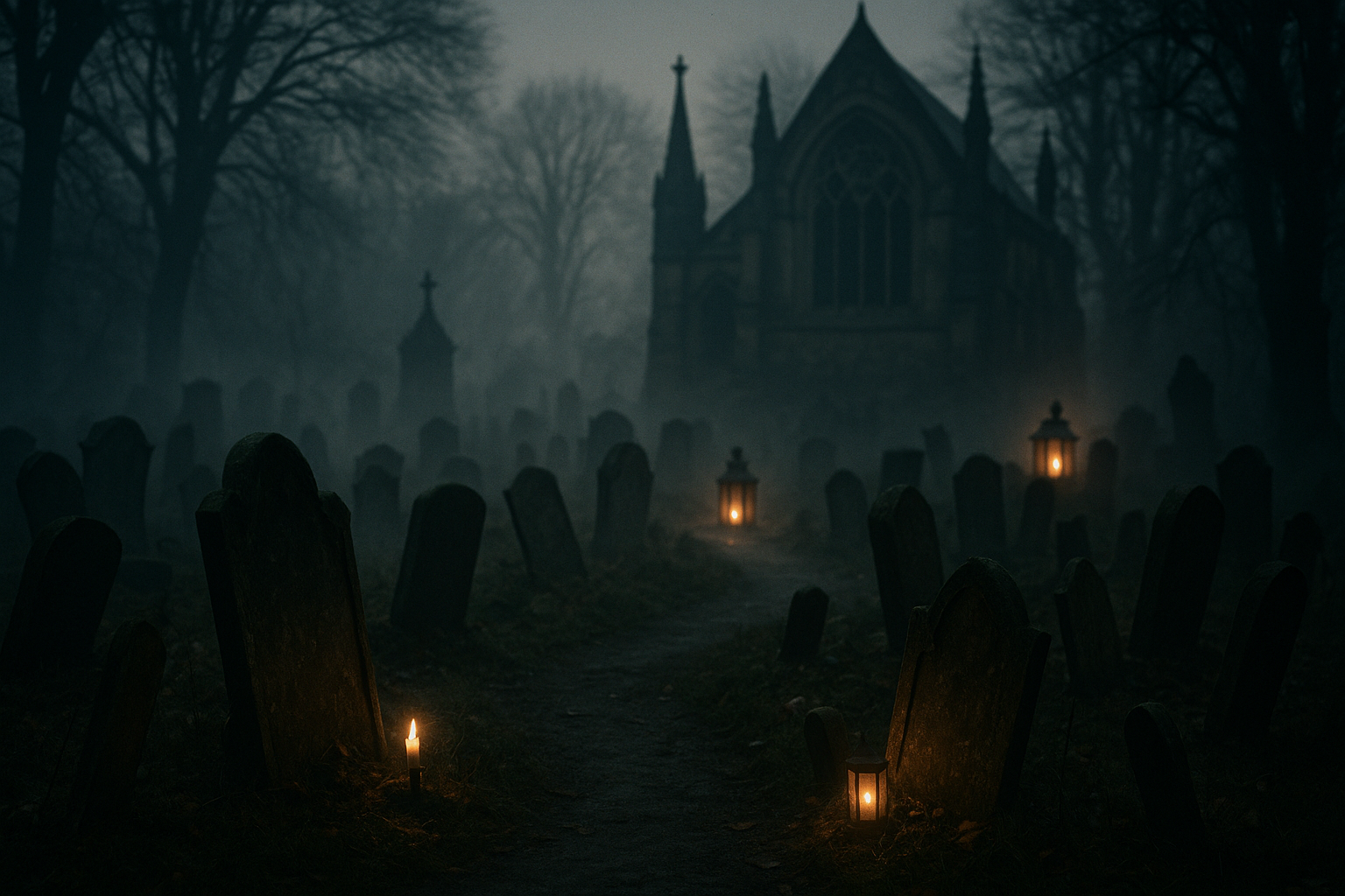 На изображении представлено таинственное кладбище, залитое туманом в ночное время. В центре пейзажа виднеются могилы с округлыми верхами, обрамленные деревьями, которые создают мрачную атмосферу. На первом плане располагаются несколько свечей, одна из которых горит, создавая мягкое тепло и контраст с холодными тенями окружающего пространства. На заднем плане выделяется старая церковь с высокими шпилями, что добавляет загадочности. Лунный свет слегка пробивается сквозь туман, освещая лишь частями мрачные могилы и создавая завораживающий эффект. В целом, картина навевает мысли о вечности и покое, смешивая элементы таинства и спокойствия.