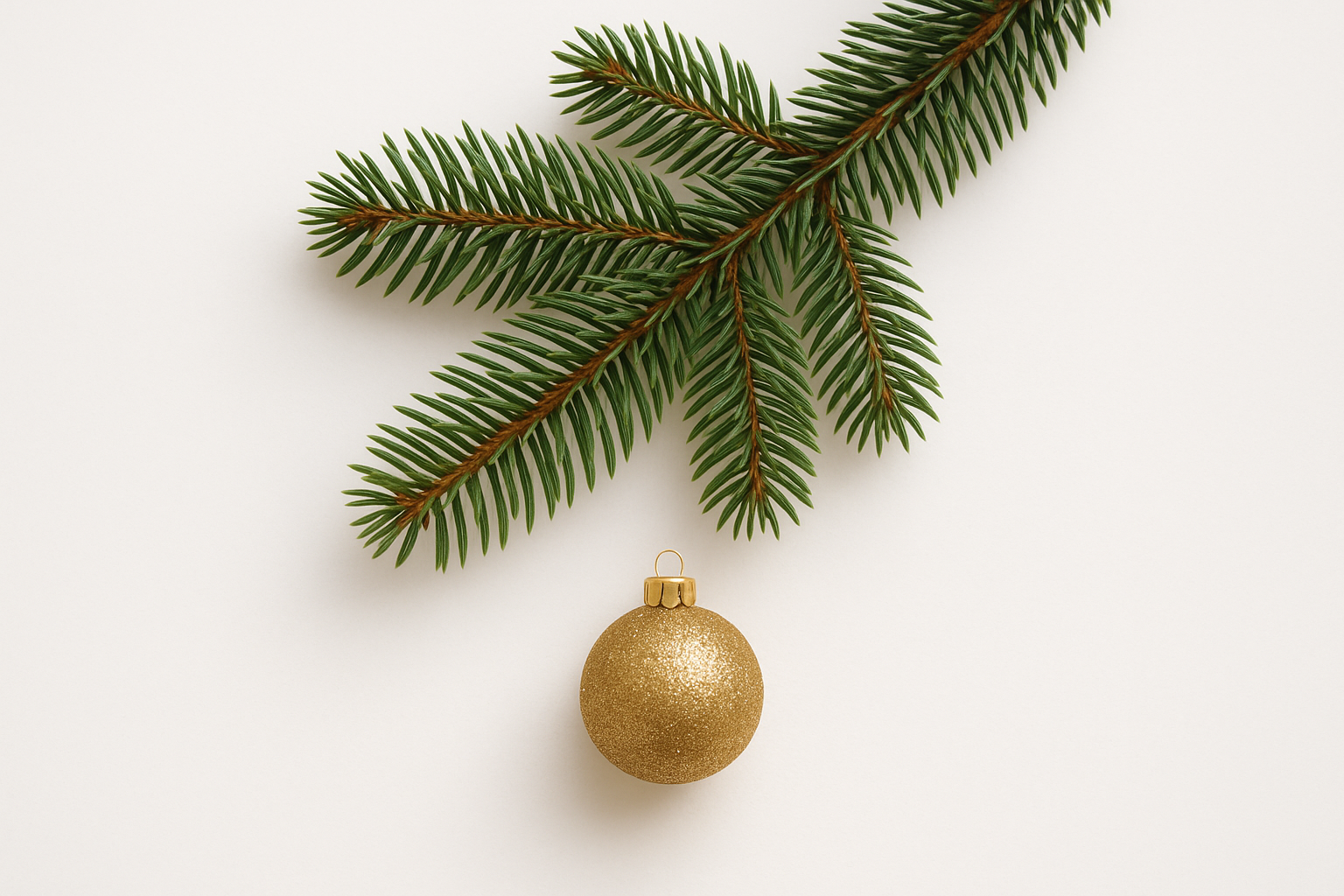 На изображении представлены еловые ветки, расположенные по диагонали, на фоне светлого нейтрального цвета. Под одной из веток находится золотой шарик, покрытый блёстками, что придаёт картине праздничное настроение. Яркие зелёные иголки хвои контрастируют с блестящей золотистой поверхностью шара, создавая гармоничную композицию, которая ассоциируется с новогодними праздниками.