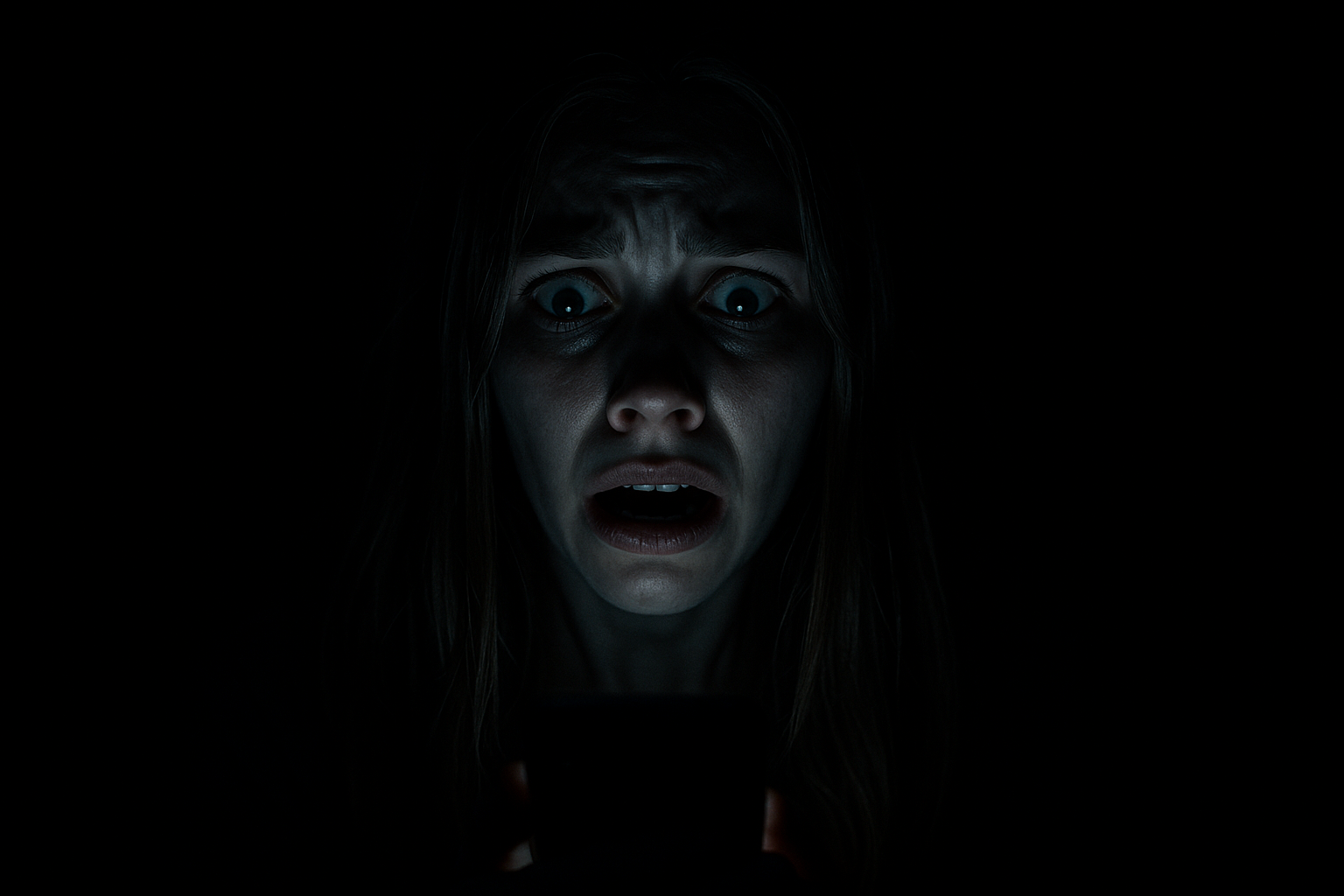 На изображении представлена женщина с четко выраженным испуганным лицом в темноте. Ее глаза широко раскрыты, а рот открыт в удивлении или страхе. Она держит телефон в руках, который, вероятно, является источником света в картине. Контраст между ее лицом и окружающей тьмой создает атмосферу напряженности и загадочности. Освещение подчеркивает черты ее лица, акцентируя внимание на эмоциях, которые она испытывает. Свет от телефона делает ее лицо белым и выделяет детали, такие как пряди волос и текстуру кожи, оставляя фоновую часть картины абсолютно черной. Вся композиция усиливает ощущение тревоги и неопределенности, побуждает зрителя задуматься о том, что же может так пугать героиню.