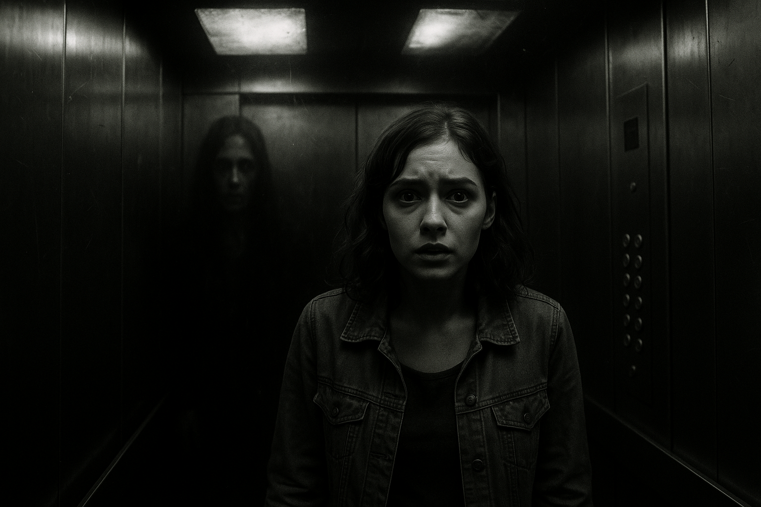 На изображении представлена женщина, стоящая в лифте. У неё выражение испуга и тревоги, она выглядит как будто застигнута врасплох. За её спиной стоит загадочное существо, едва различимое в полутемном пространстве лифта с деревянными панелями. Освещение в лифте тусклое, создающее ощущение недостатка воздуха и угрюмой атмосферы. Женщина одета в темную футболку и джинсовую куртку, её волосы темные и слегка растрепанные. Призрак, стоящий за ней, имеет длинные темные волосы и бледное, почти прозрачное лицо, что усиливает эффект страха. Основные цвета изображения — черный и серый, с едва заметными источниками света сверху.