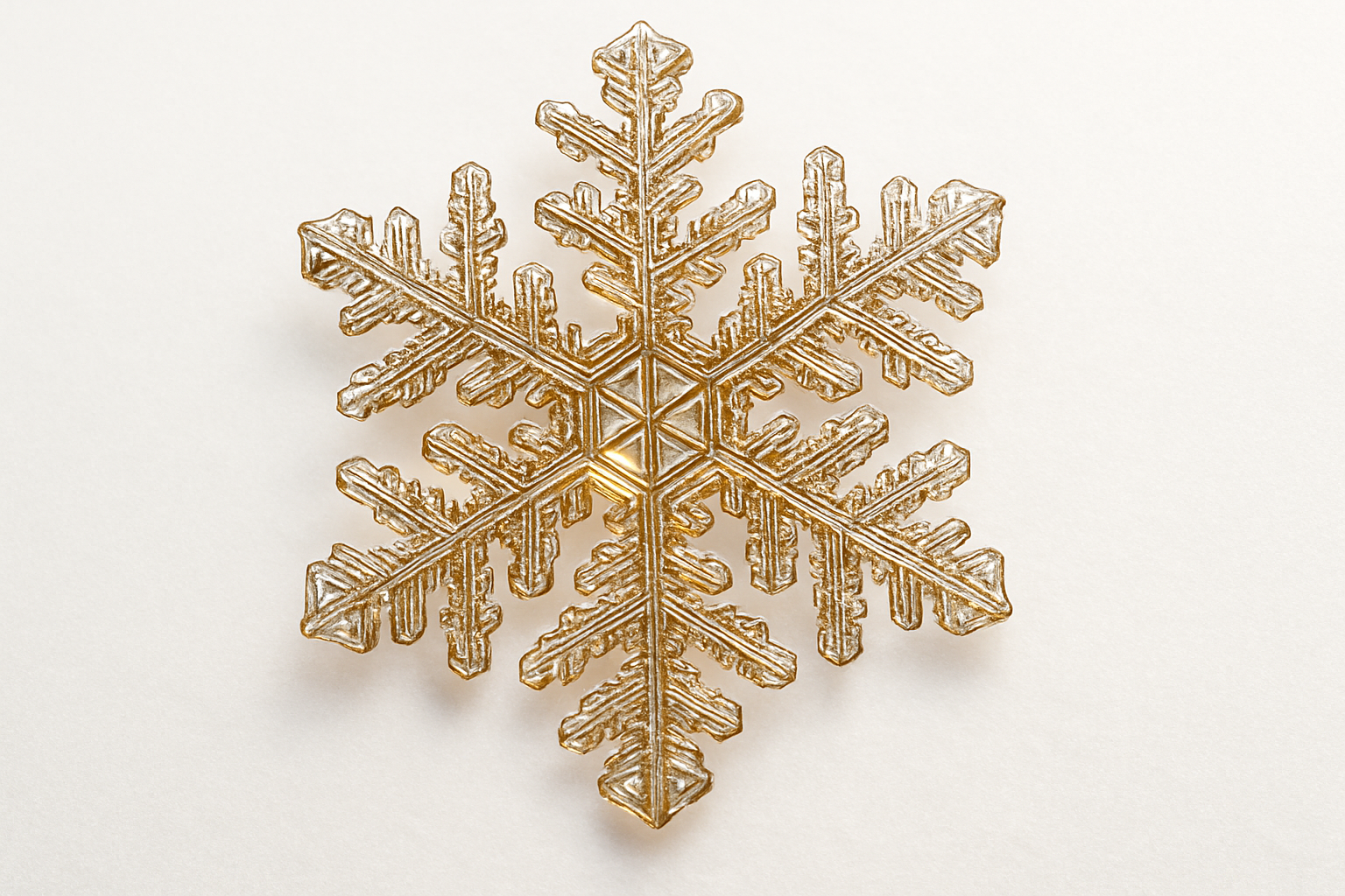 Эта изображение демонстрирует зимний элемент декора — снежинку, выполненную в золотом цвете. Снежинка имеет сложную геометрическую форму, состоящую из шести основных лучей, каждый из которых украшен изящными деталями. На фоне используется чистый белый цвет, который создает контраст и подчеркивает красоту зимнего символа.