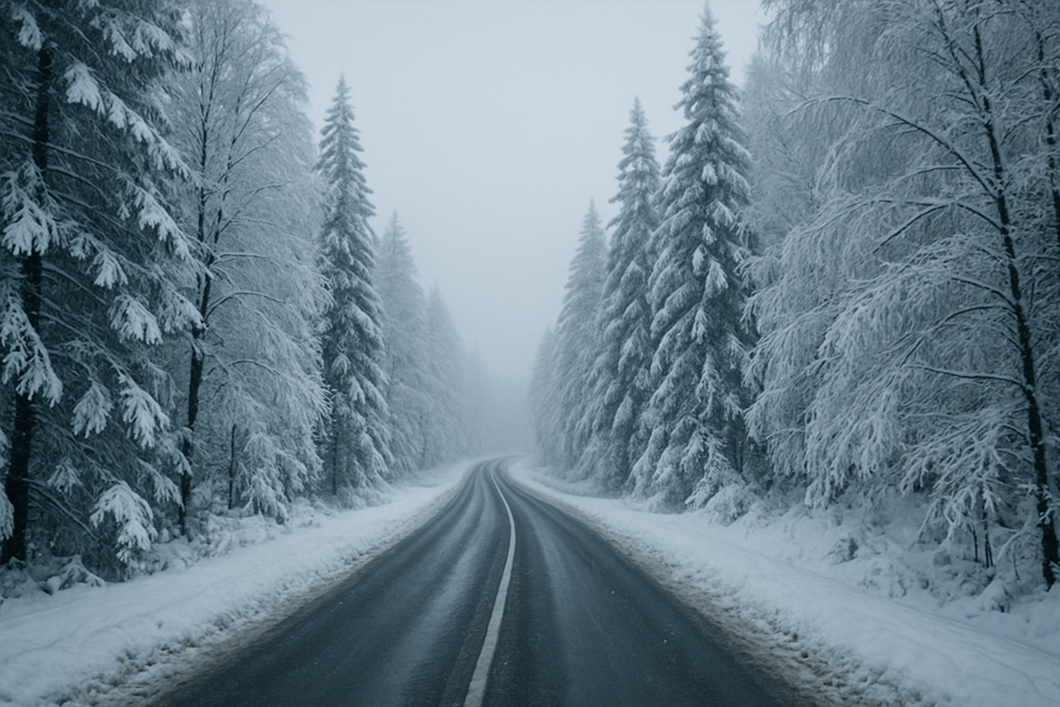 На изображении представлена зимняя дорога, извивающаяся между высокими деревьями, покрытыми густым слоем снега. Вдали виден туман, создающий ощущение таинственности и спокойствия. Деревья, обросшие белыми снежинками, создают сказочную атмосферу холодного зимнего дня. Дорога, покрытая снежной пеленой, напоминает о зимних путешествиях и уюте, который приносит этот морозный сезон. Этот пейзаж постигла зима, и природа выглядит особенно живописно и впечатляюще.