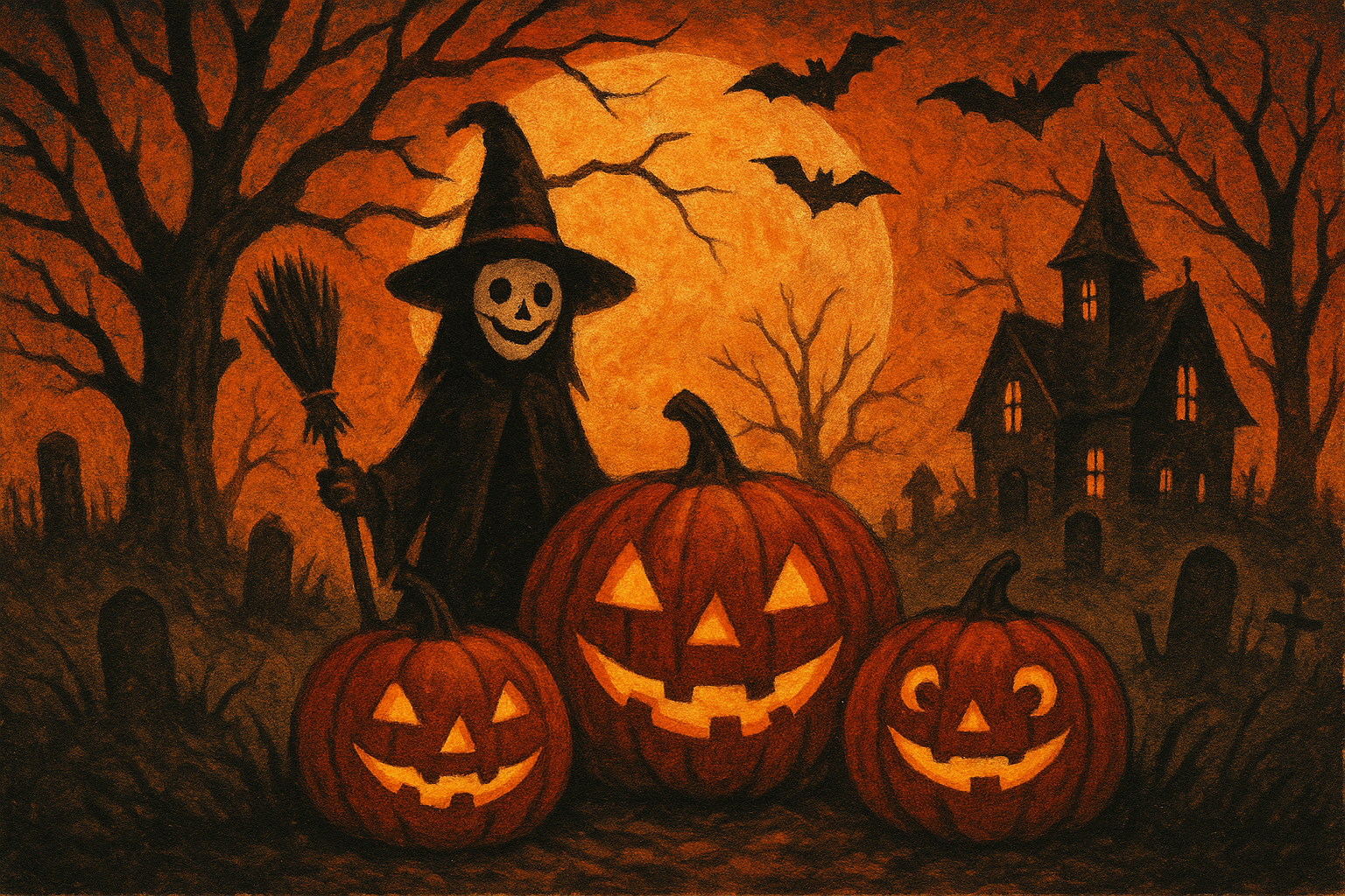 На изображении представлена зловещая хэллоуинская сцена. В центре внимания – три тыквы с вырезанными лицами, стоящие на фоне большой, ярко-оранжевой луны. Рядом с тыквами стоит ведьма с метлой, облаченная в черное одеяние и шляпу. Ее лицо изображено с широкими улыбкой и череповидным видом. На фоне виднеются голые деревья и тёмный, загадочный дом с окнами, сверкающими в ночи. Позади летят несколько летучих мышей, что делает атмосферу ещё более пугающей и таинственной.