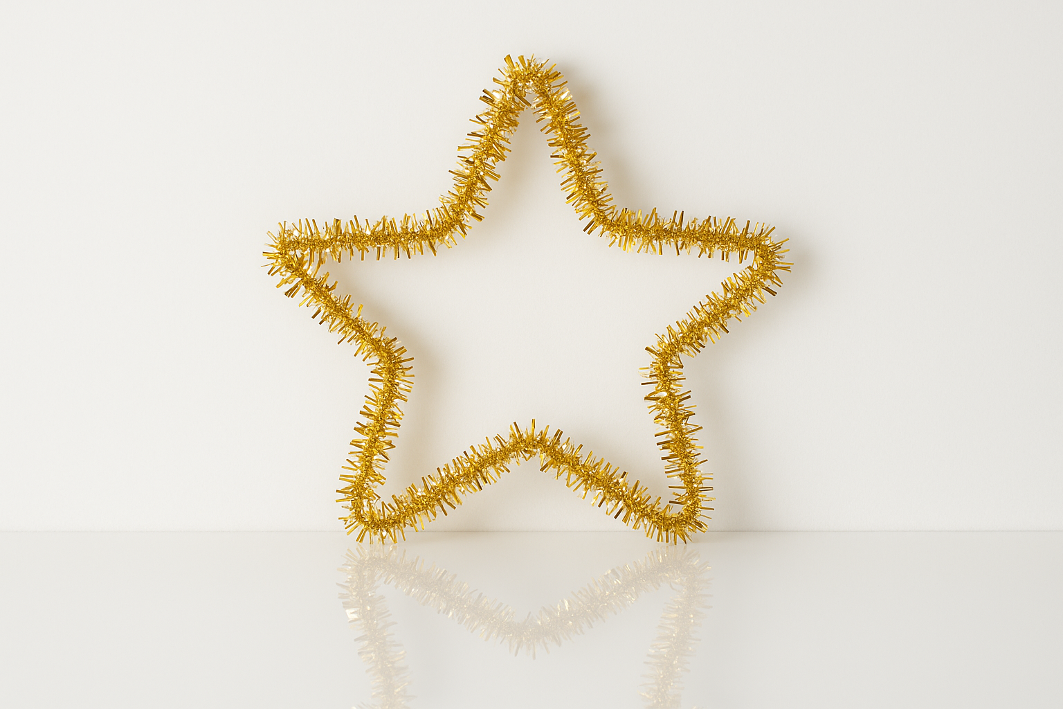 На изображении представлена золотая звезда, выполненная из мишуры. Эта звезда занимает центральное место на светлом фоне, создавая чистый и минималистичный вид. Мишура имеет яркий блестящий эффект, что придаёт ей праздничный вид. Звезда идеальной формы, отмечающая важные моменты и события. Отражение на поверхности подчеркивает гладкость и блеск звезды, создавая эстетически приятный образ. Такой элемент декора может использоваться в различных застольях и праздниках, добавляя атмосферу радости и волшебства.
