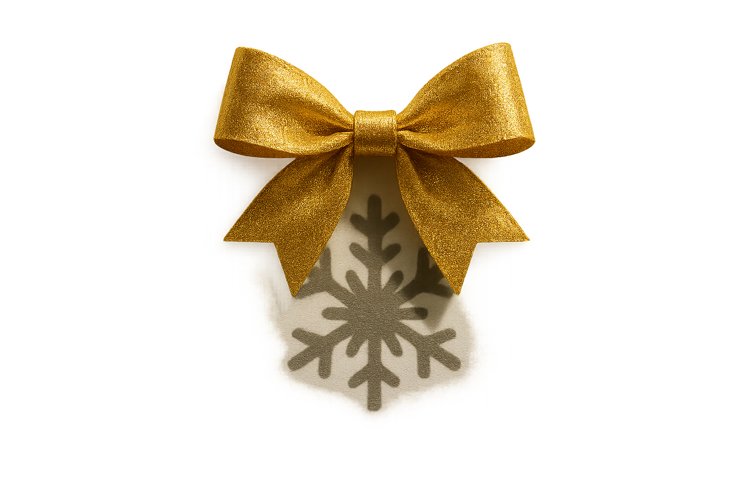 На изображении представлен яркий золотой бантик, аккуратно оформленный с глубокими складками и блестящей текстурой. Бантик находится на светлом фоне, а под ним нарисована тень в виде снежинки, создающая ощущение зимней атмосферы. Элементы дизайна гармонично сочетаются, привнося в композицию атмосферу праздника и уюта. Контраст между материалом банта и тенью создает визуальное разнообразие и привлекает внимание к деталям, подчеркивая игровой характер экрана. Все это делает изображение подходящим для использования в новогодних или рождественских тематических проектах, для создания праздничного настроения.